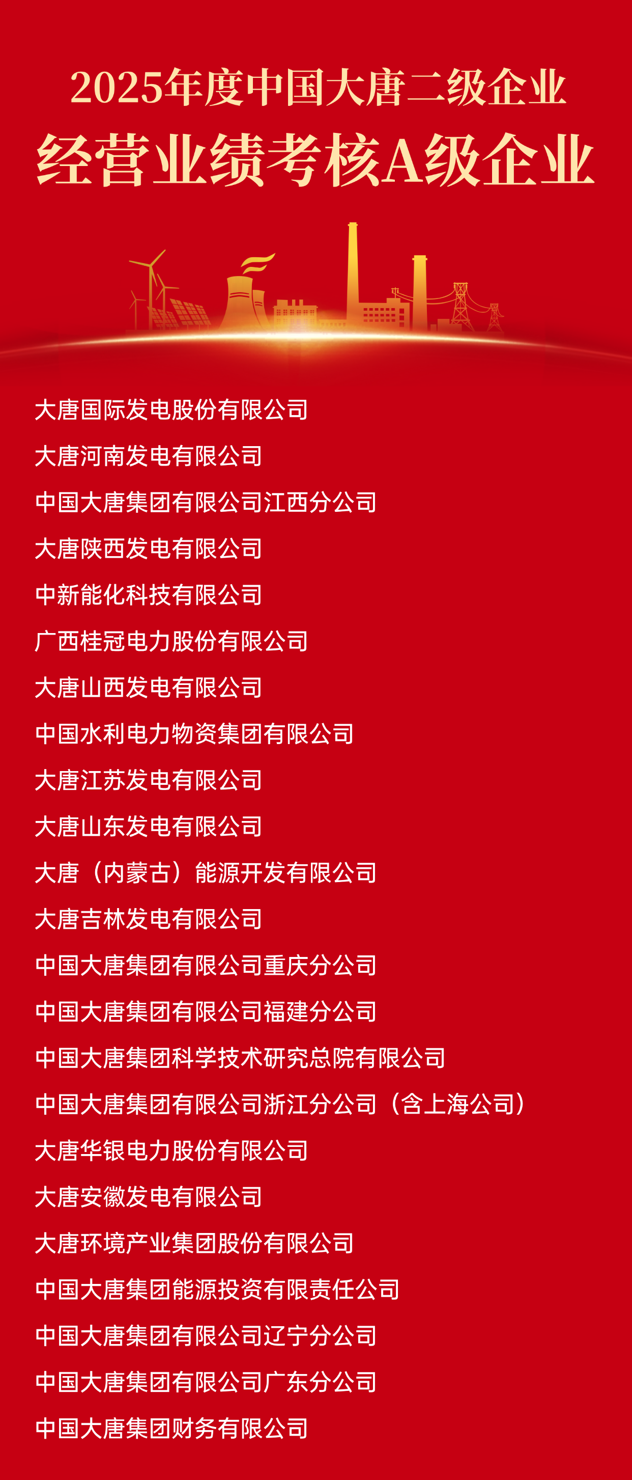 根据《中国大唐集团二级企业及负责人经营业绩考核办法》及有关规定,2025年度二级企业经营业绩考核结果已经中国大唐2026年第1次董事长专题会审议通过。A级企业名单如下: