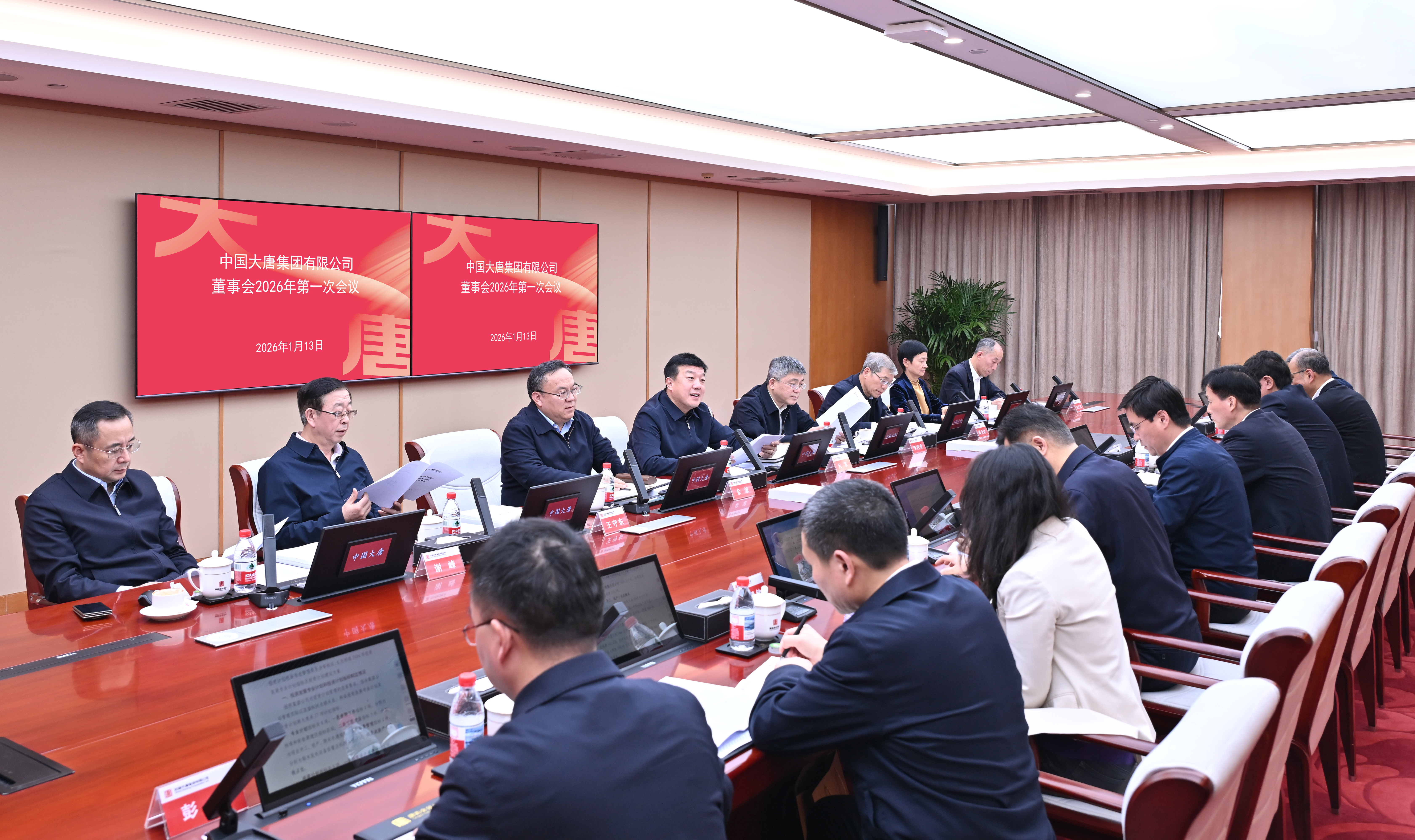 1月13日,中国大唐集团有限公司董事会2026年第一次会议及相关专门委员会会议在京召开。集团公司董事长、党组书记吕军主持会议,董事、总经理、党组副书记李向良,董事、党组副书记余波,外部董事黄永达、王守东、段湘晖、谢峰,职工董事田广河参加会议。