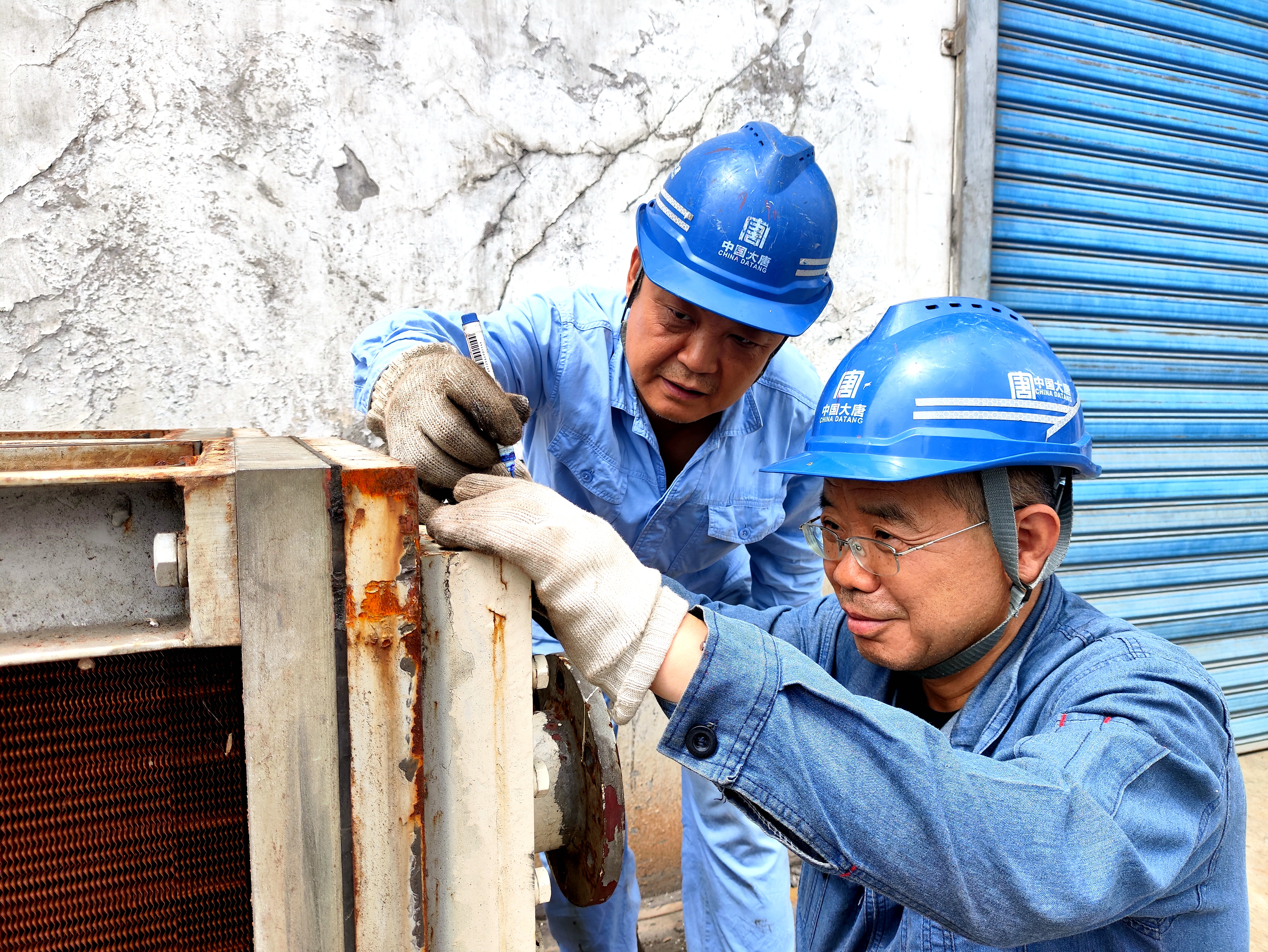 罗强、王旭、孙斌、惠永江、代晓龙到位后,分成两组迅速投入工作,一组开始清理氢冷器管口的水垢,另一组制作密封垫。