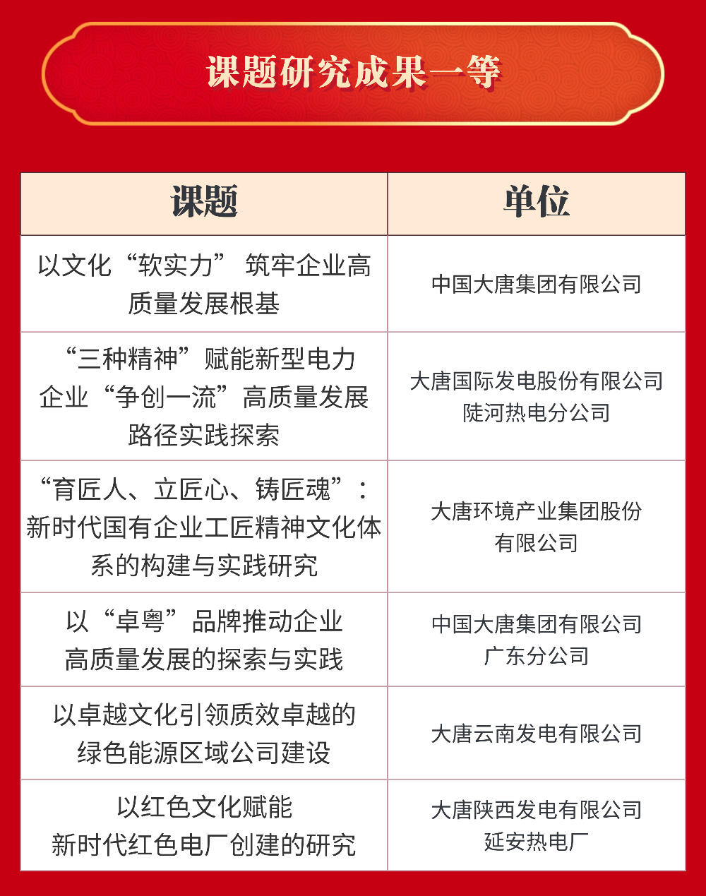 大唐国际发电股份有限公司等22家单位获评“十四五”企业文化建设与管理典型案例;中国大唐及所属8家单位获评“十四五”企业文化建设与管理典型经验;中国大唐及所属5家单位获评课题研究成果一等;大唐国际发电股份有限公司张家口发电分公司等6家单位获评课题研究成果二等。具体名单如下: